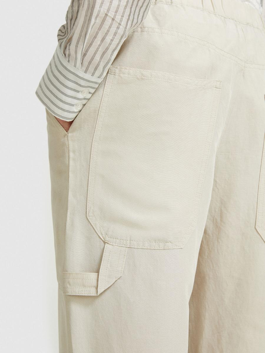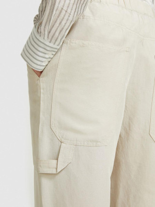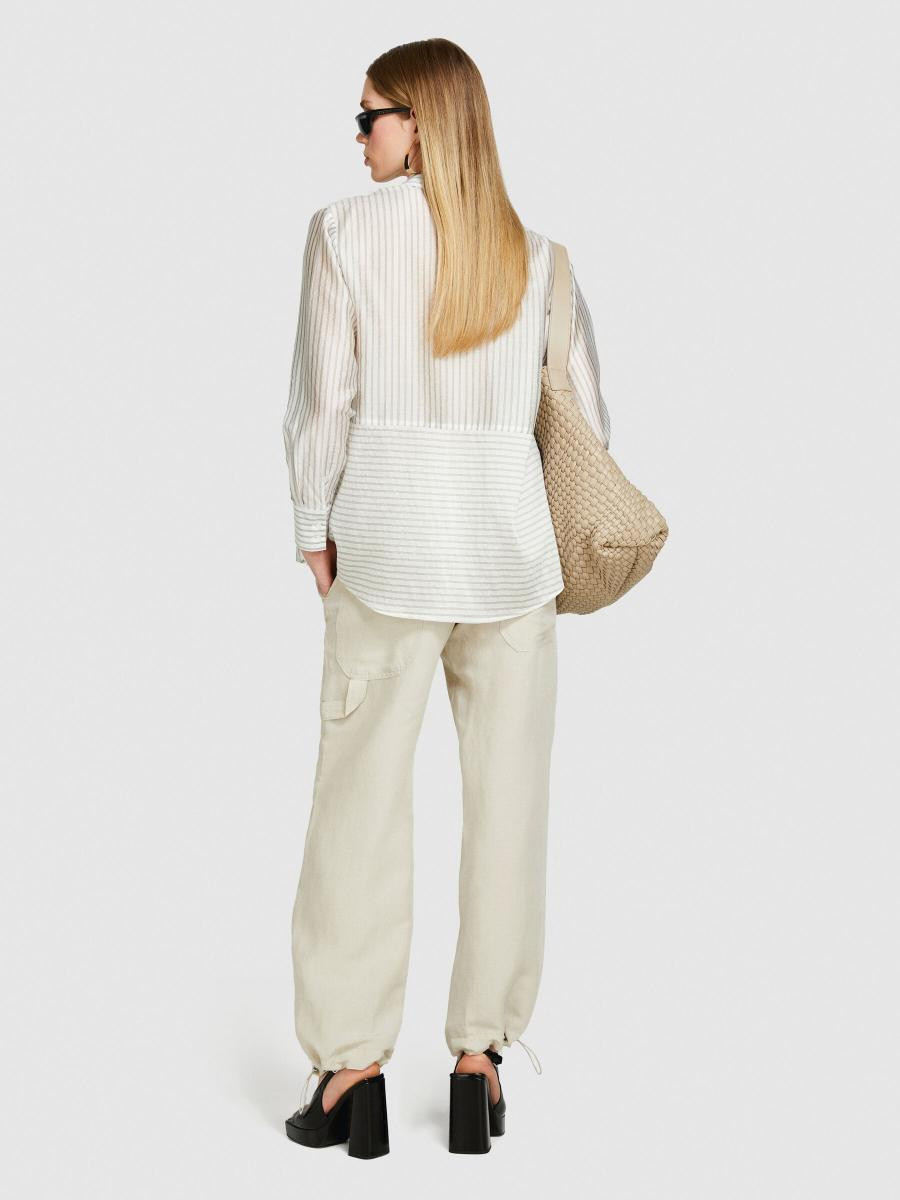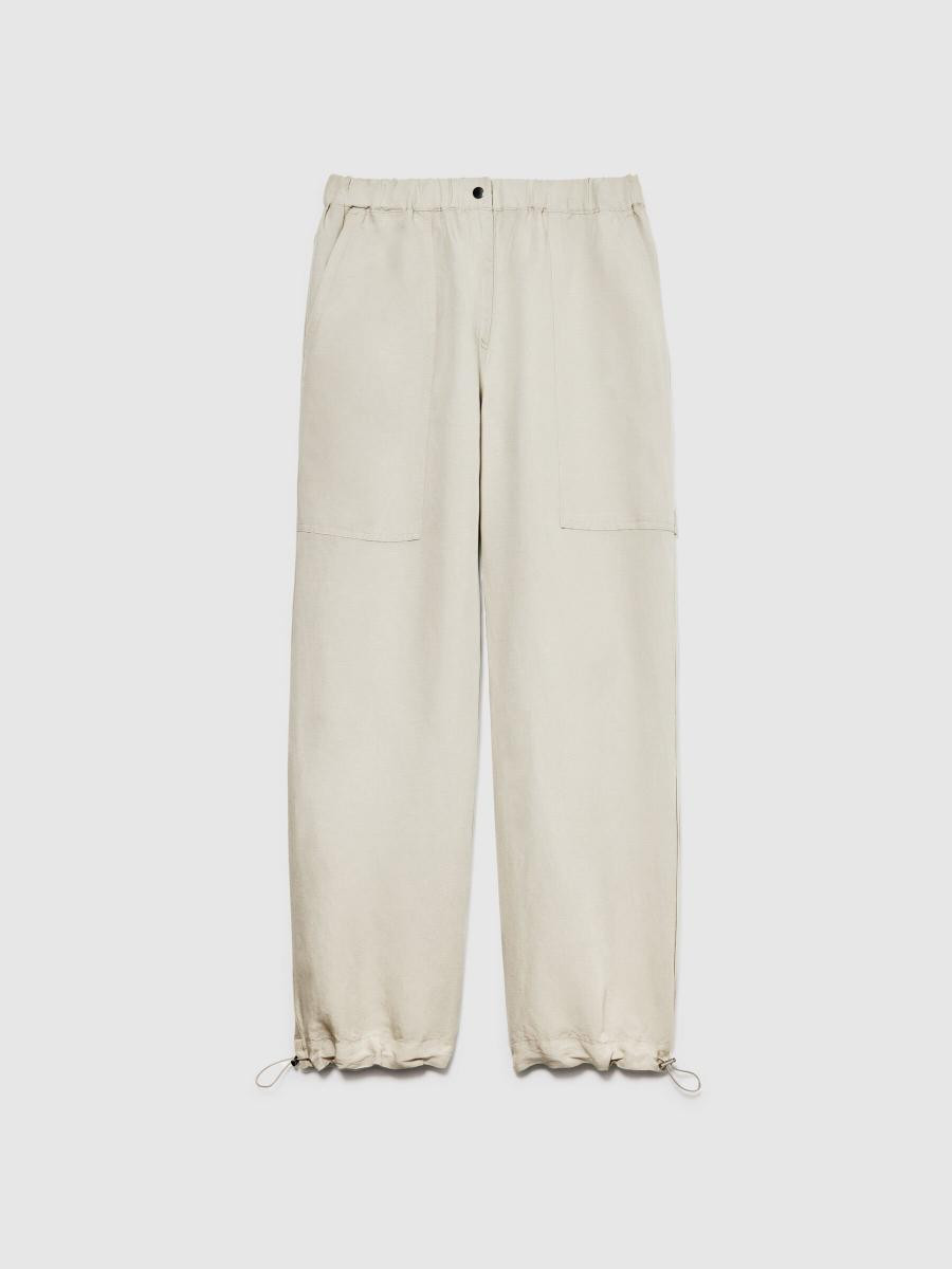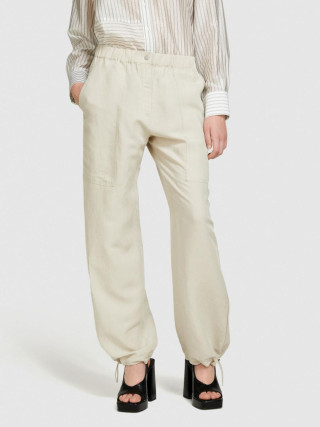 Sisley ženske cargo pantalone od mešavine lana i rajona, sa podesivim vezicom na dnu. Elastični struk, patent zatvarač i dugme, dva prednja džepa i dva našivena džepa na zadnjoj strani.