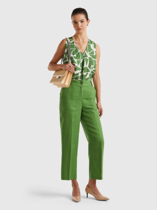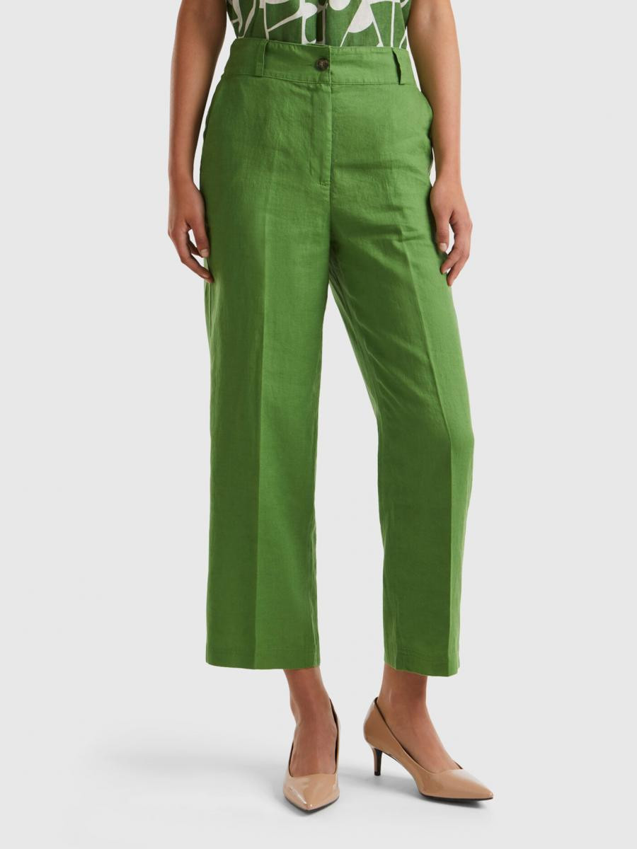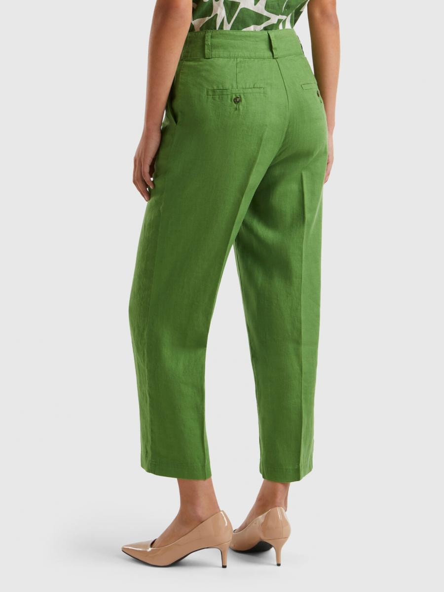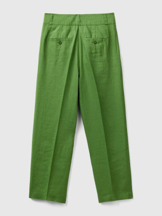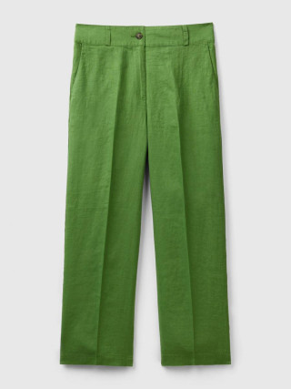 Benetton ženske pantalone ravnog kroja, do skočnog zgloba sa centralnim peglanim naborom. Kopčanje sa patent zatvaračem i dugmeta, prednji džepovi i džepovi sa rubom na zadnjoj strani. Ovaj komad je napravljen od čistog lana: otpornog biljnog vlakna koje se može reciklirati i koje troši minimalne prirodne resurse.