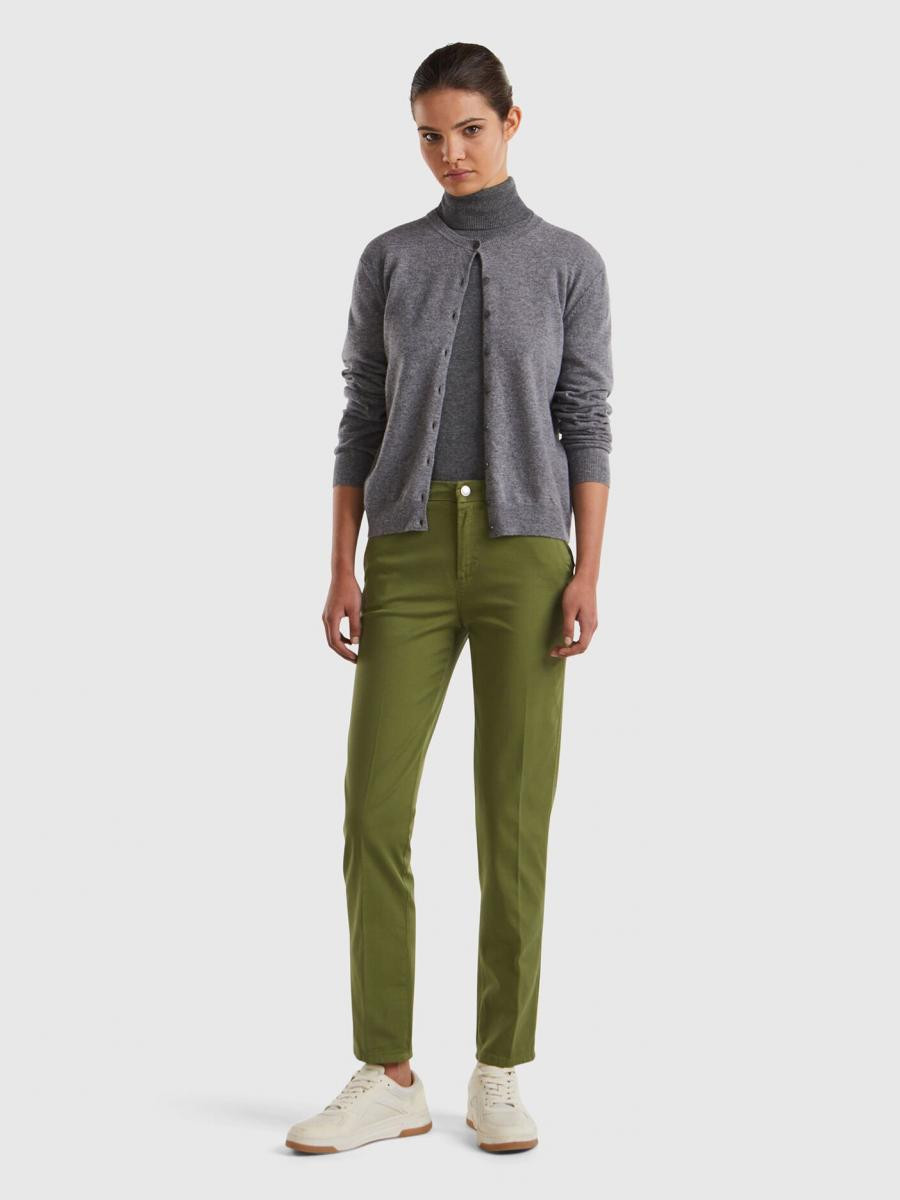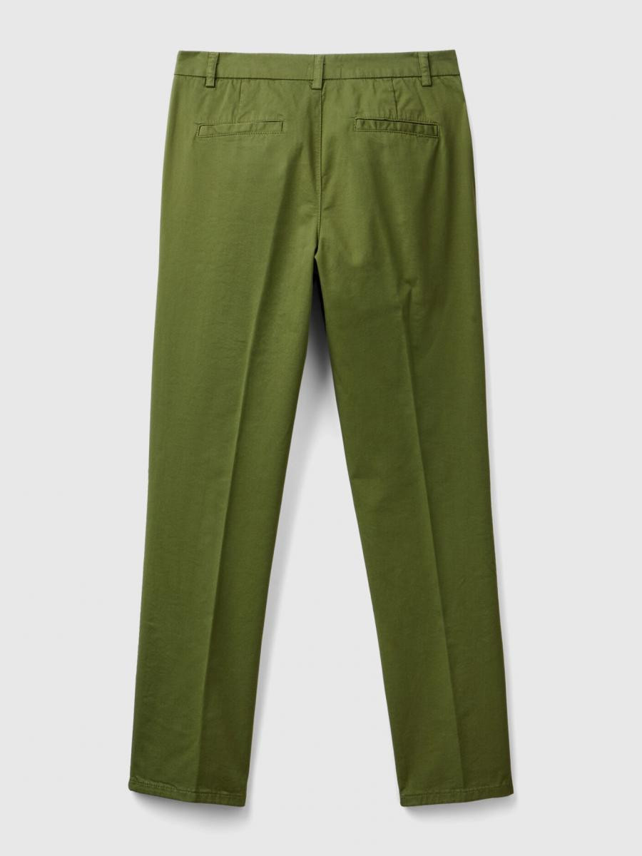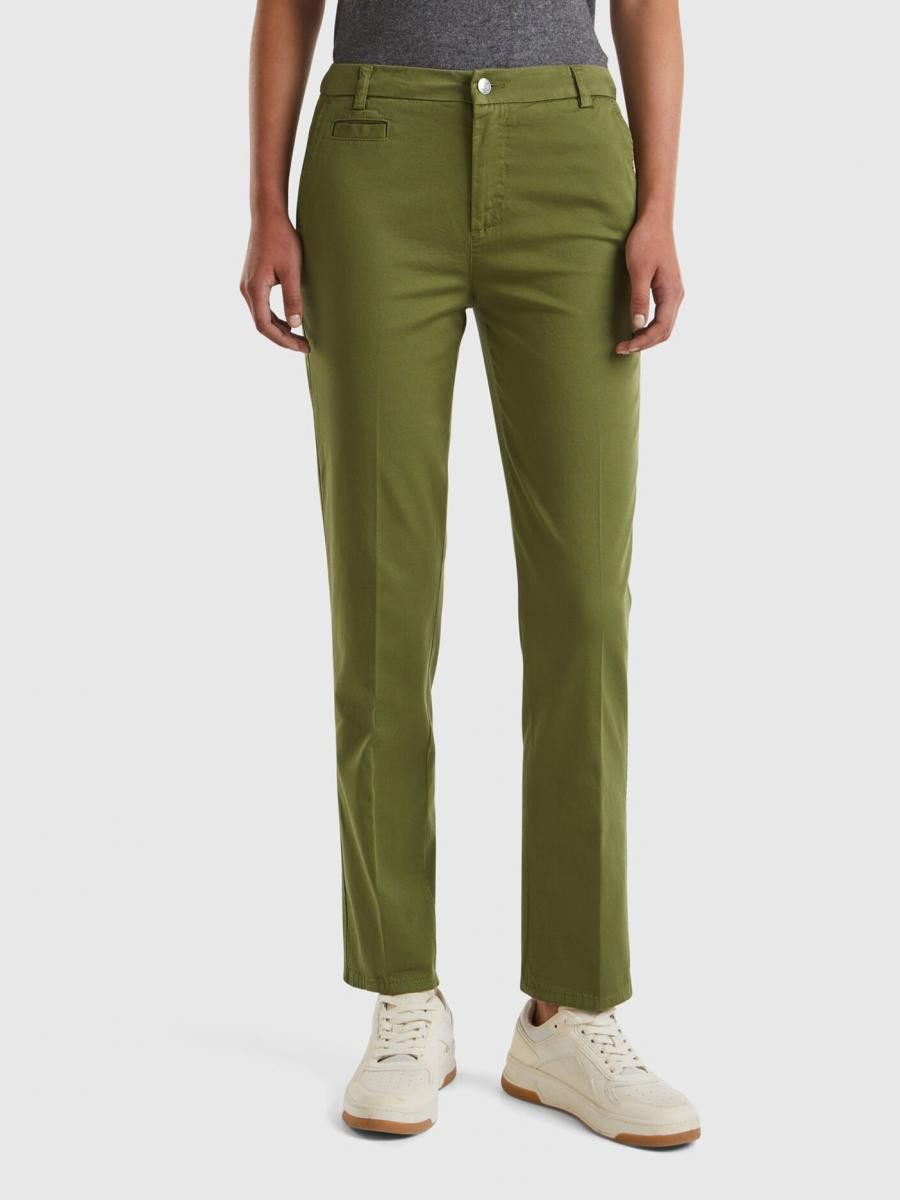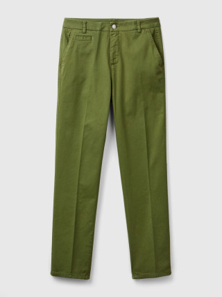 Benetton ženske pantalone u chino stilu od rastegljivog pamuka, slim fit model. Opremljene su praktičnim prednjim džepovima, sa kopčanjem rajsferšlusom i otvaranjem na dugmad. Ležerna odeća pogodna i za kancelariju i za slobodno vreme.