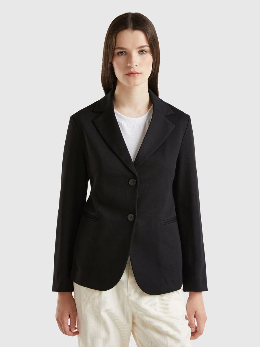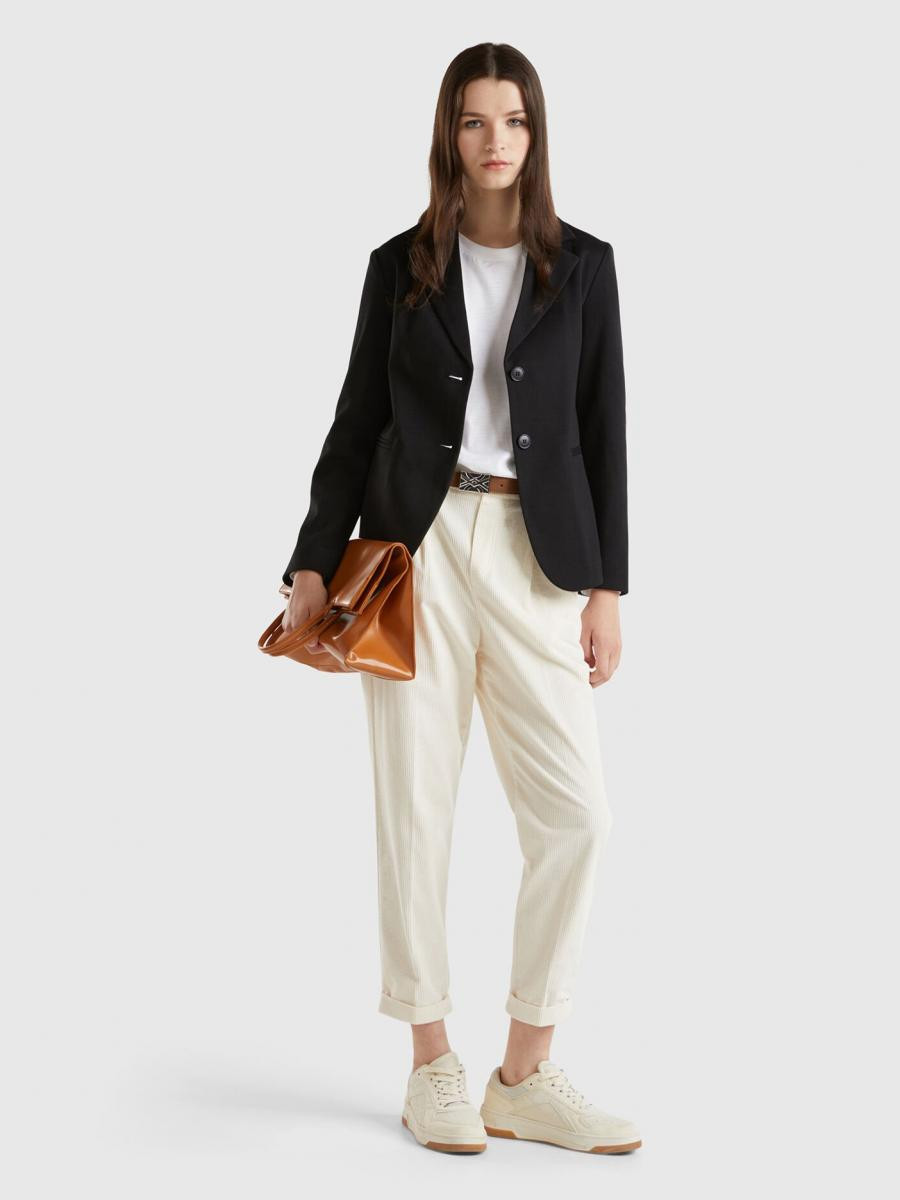 Benetton ženski sako od meke pamučne tkanine, sa kragnom na rever i otvaranjem na dva dugmeta. Dugi rukavi i džepovi sa rubom na prednjoj strani. Minimalnog stila, idealno za grad.
