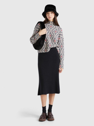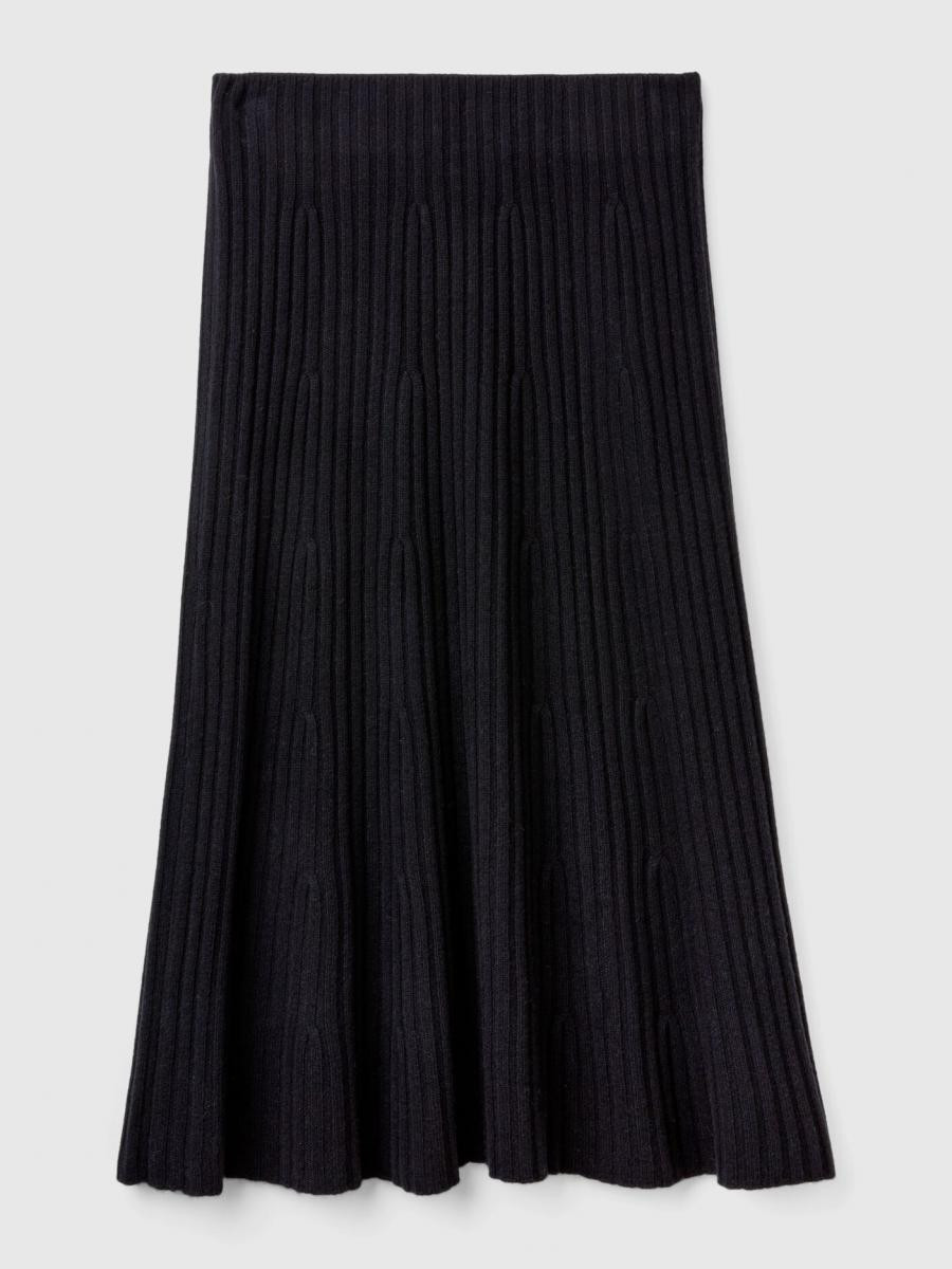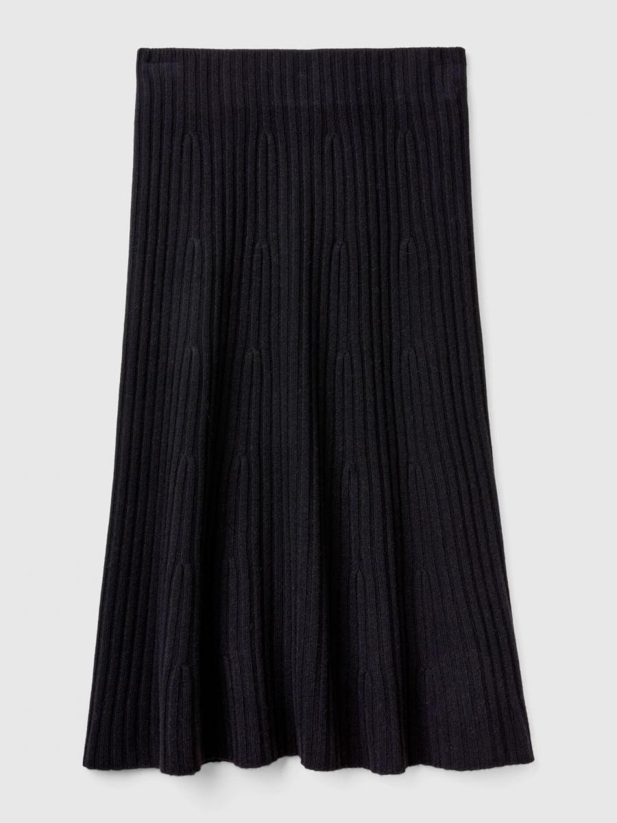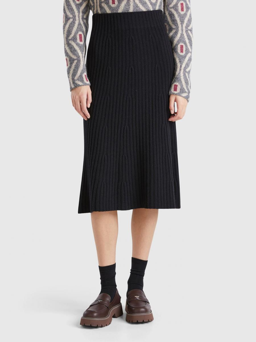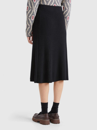 Benetton ženska midi suknja od meke mešavine vune pletena sa širokim rebrima. Rašireni kroj sa udobnim unutrašnjim elastičnim pojasom.