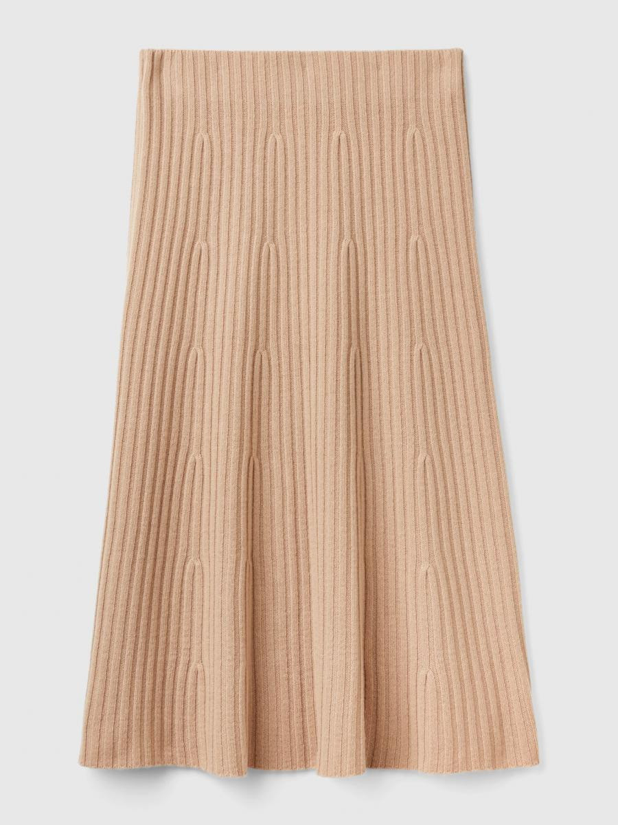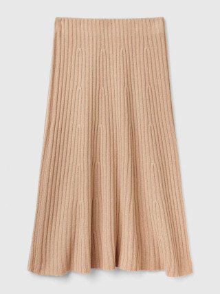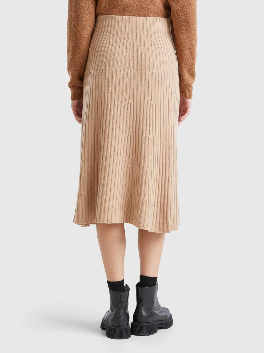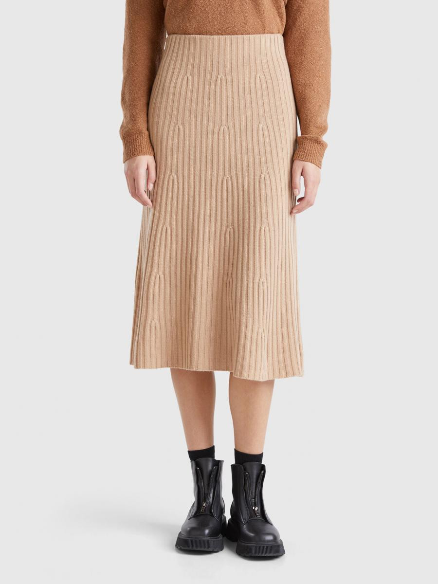 Benetton ženska midi suknja od meke mešavine vune pletena sa širokim rebrima. Rašireni kroj sa udobnim unutrašnjim elastičnim pojasom.