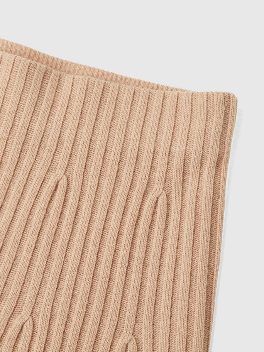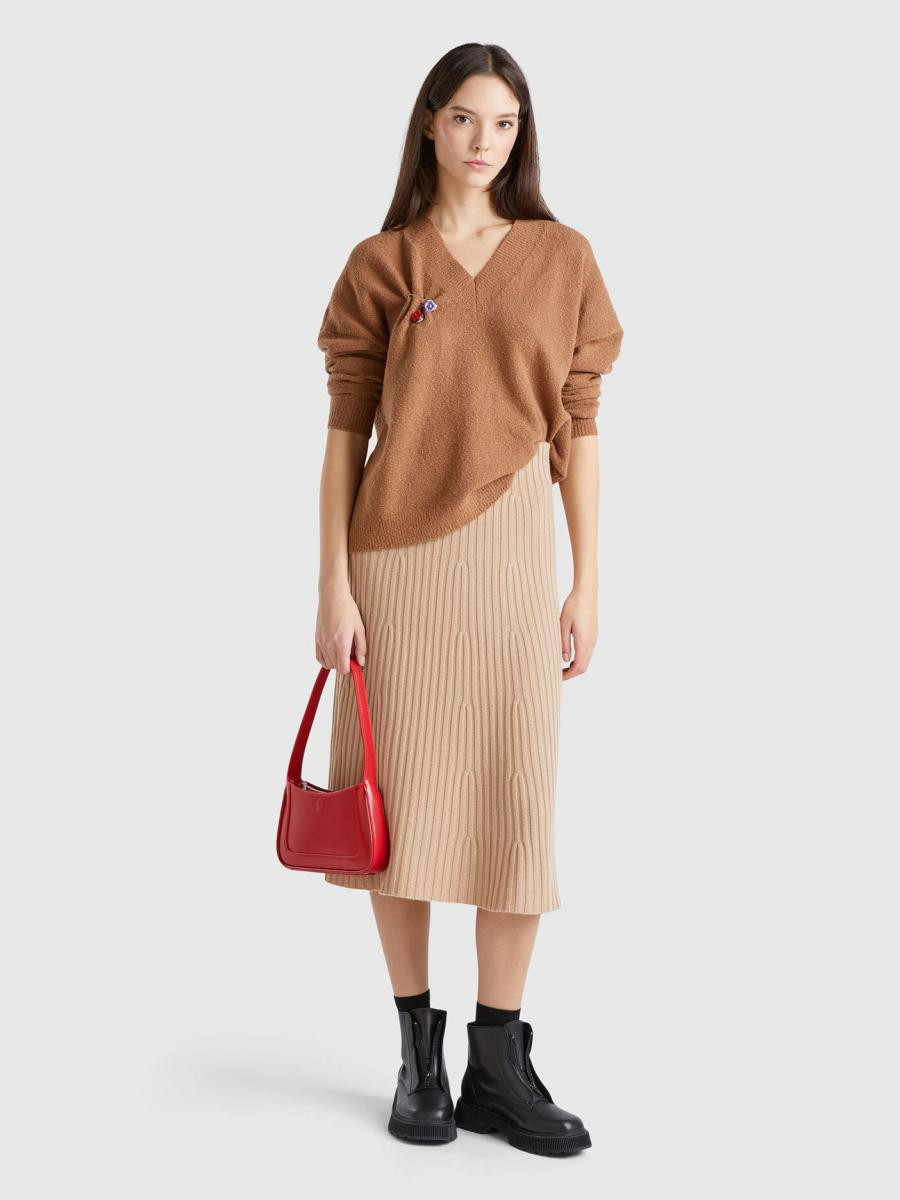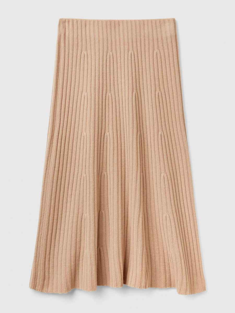 Benetton ženska midi suknja od meke mešavine vune pletena sa širokim rebrima. Rašireni kroj sa udobnim unutrašnjim elastičnim pojasom.