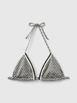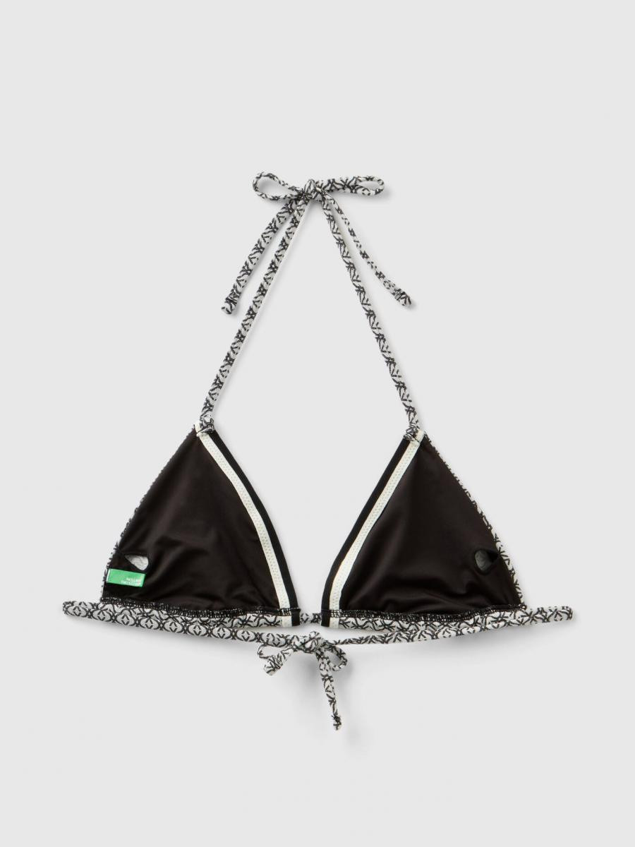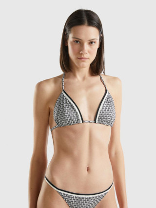 Benetton ženski kupaći kostim gornji deo, B korpe, klizni trouglasti bikini od rastegljive tkanine sa lureksom. Vezice za vezivanje na vratu i leđima, dvobojna prugasta ivica na dekolteu. Štampa monograma, dobijena sastavljanjem više logotipa uboda da bi se formirao uzorak.
