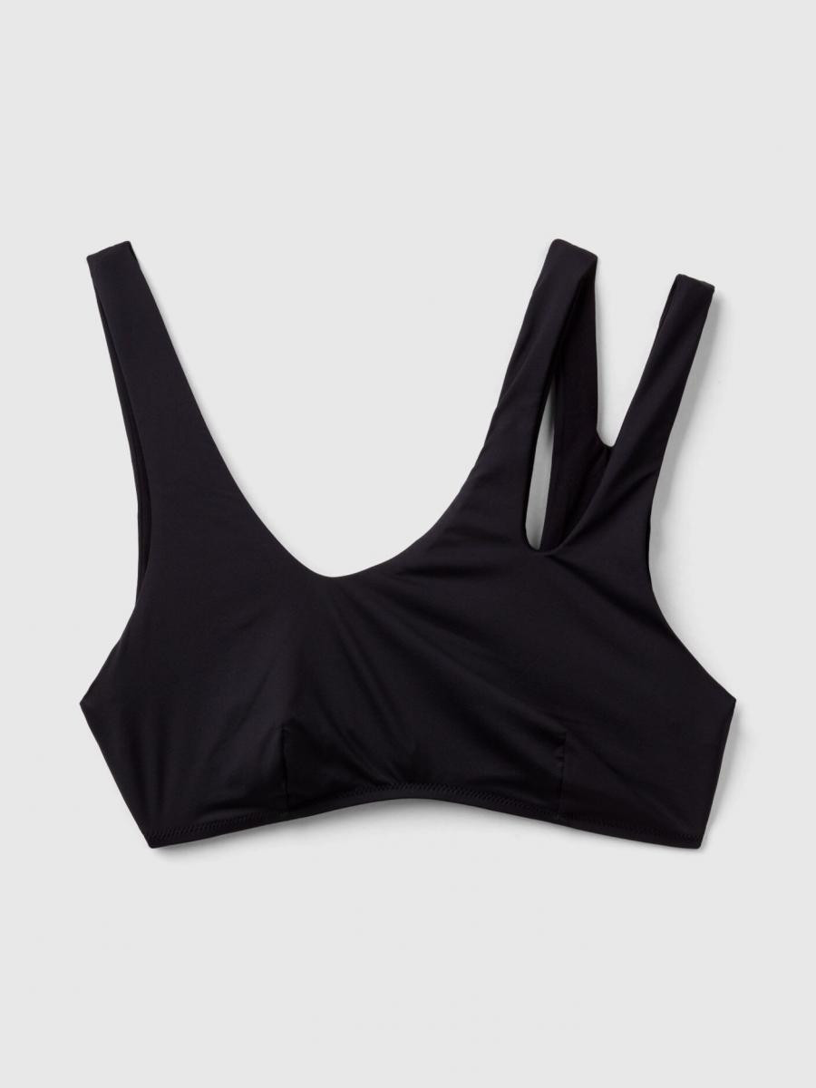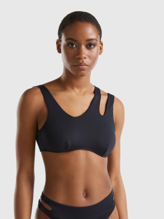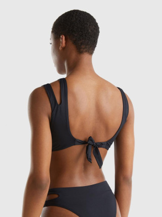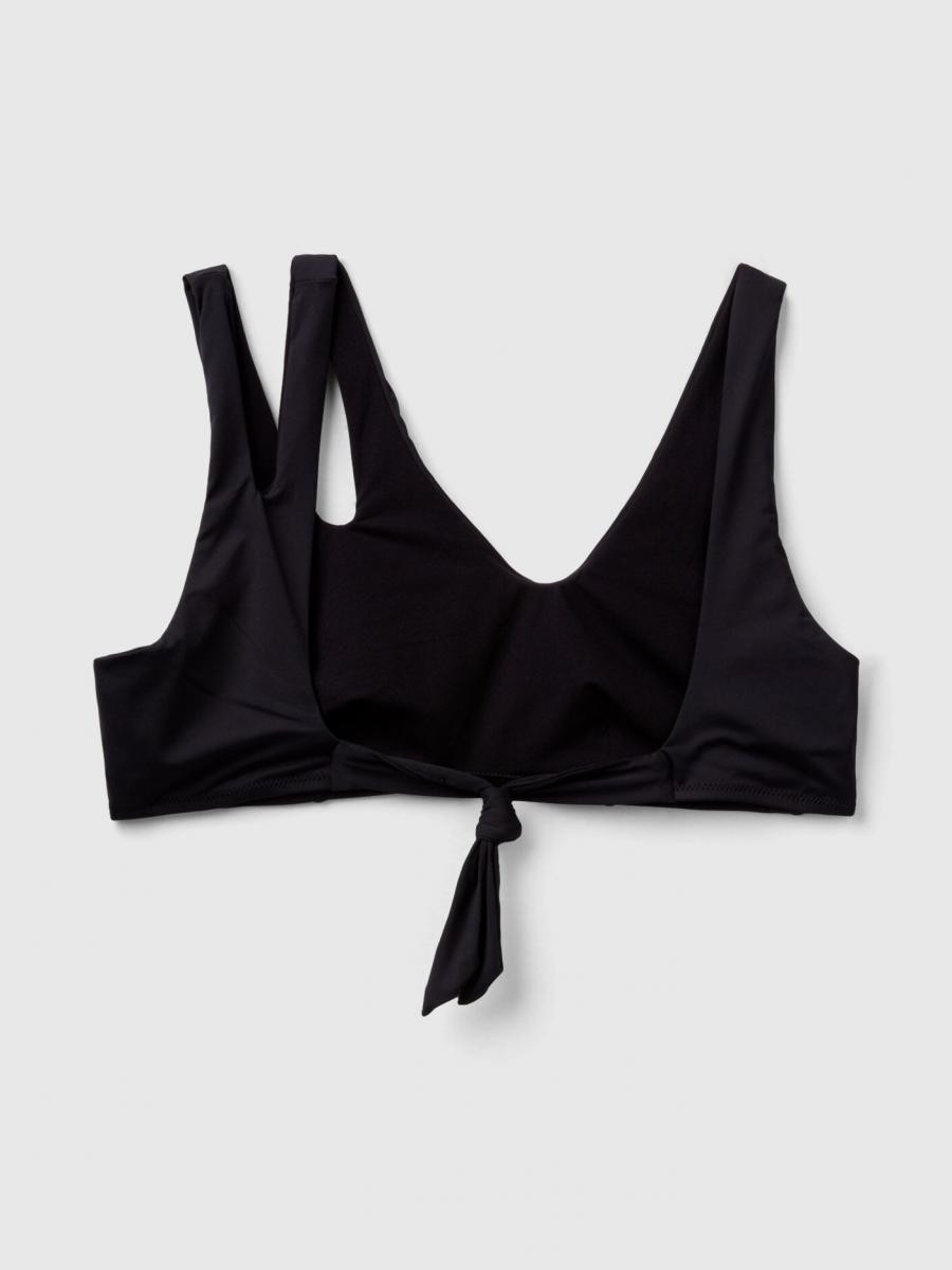Benetton ženski kupaći kostim gornji deo, B korpa od rastegljive tkanine. Izrezani motiv na naramenici, vezane vezice na leđima. Napravljen od ECONIL, 100% regenerisanog najlonskog vlakna sa beskonačnim mogućnostima recikliranja.