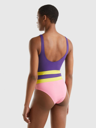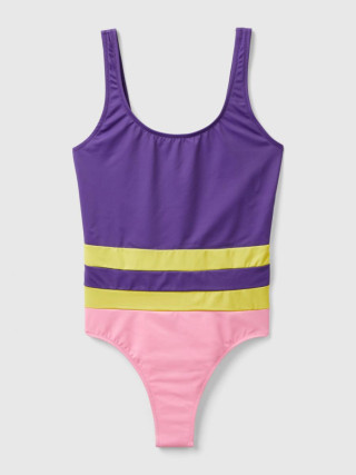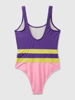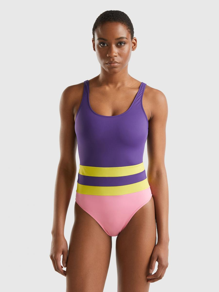 Benetton ženski jednodelni kupaći kostim B korpa, sa okruglim izrezom, dubljim pozadi. Kolor blok dizajn i srednje naramenice. Napravljen od ECONIL, 100% regenerisanog najlonskog vlakna sa beskonačnim mogućnostima recikliranja.